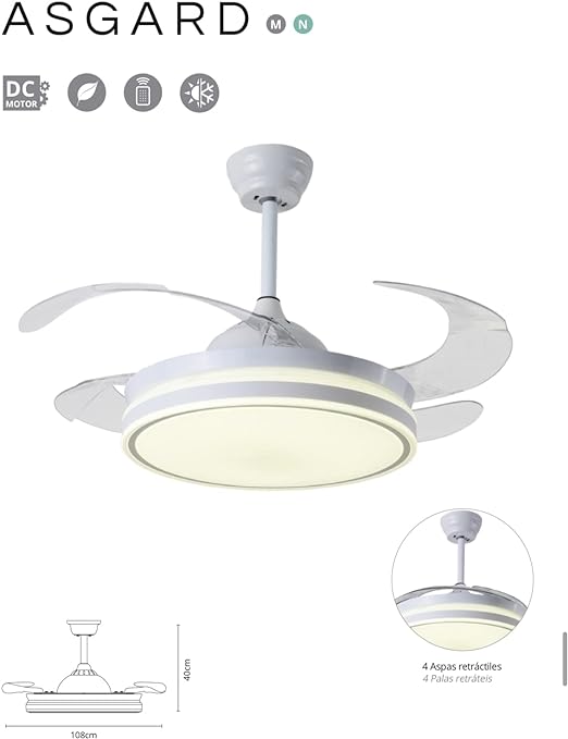 • 🔄 Ventilador modelo ASGARD realizado en metal y policarbonato, con CUATRO aspas desplegables de metacrilato muy resistentes de color transparente, con un diseño moderno que nos permite ambientar tanto dormitorios como salones, comedores, etc
