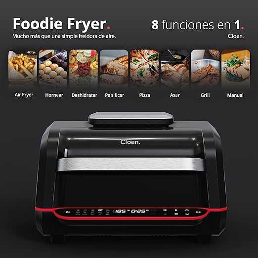 • 8 funciones en 1: Air Fryer, Hornear, Deshidratar, Panificar, Pizza, Asar, Grill, Manual.