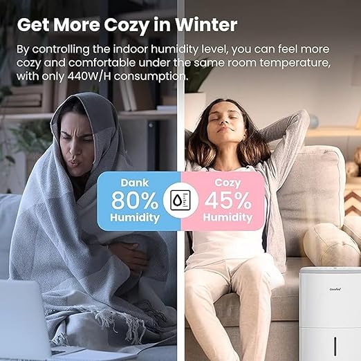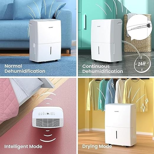 - DESHUMIDIFICACION INTELIGENTE Y SECADOR DE ROPA: Equipado con un sensor de humedad incorporado, que puede monitorear el nivel de humedad en tiempo real, este deshumidificador puede mantener el nivel de humedad interior entre el 45% y el 55%, que son agradables para la vida. Drenaje Continuo, no solo deshumidificación, buen asistente para secar la ropa, su otra secadora de ropa